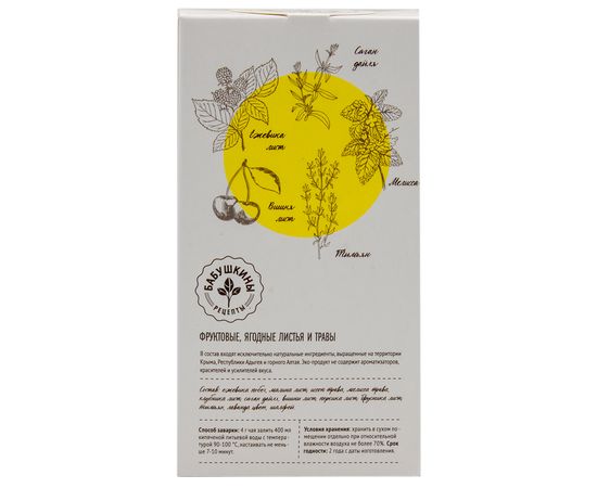 Ежевика побег, малина лист, иссоп трава, мелисса трава, клубника лист, саган дайля, вишня лист, персика лист, брусника лист, тимьян, лаванда цвет, шалфей